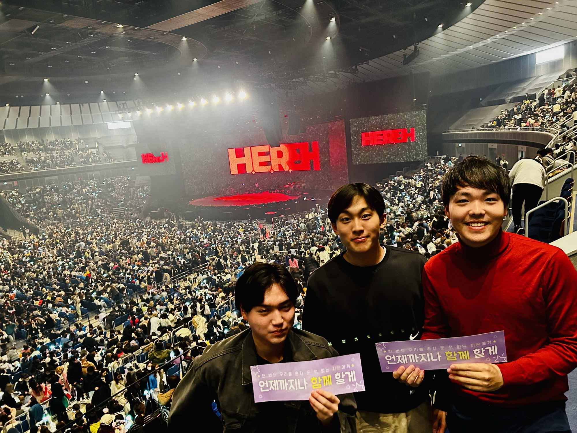 ステージ脇のスクリーンにカナカシ(歌詞をカタカナで書く)が表示されるので、会場のイエナ(IUのファンのこと)がみんな歌ってました。
